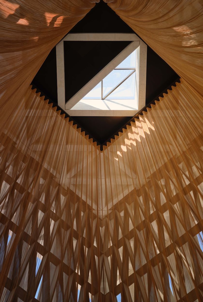 Within the Moses Ben Maimon Synagogue, a bronze mesh tent drapes from the ceiling’s central skylight, which allows mid-day sun and a view to the cosmos.