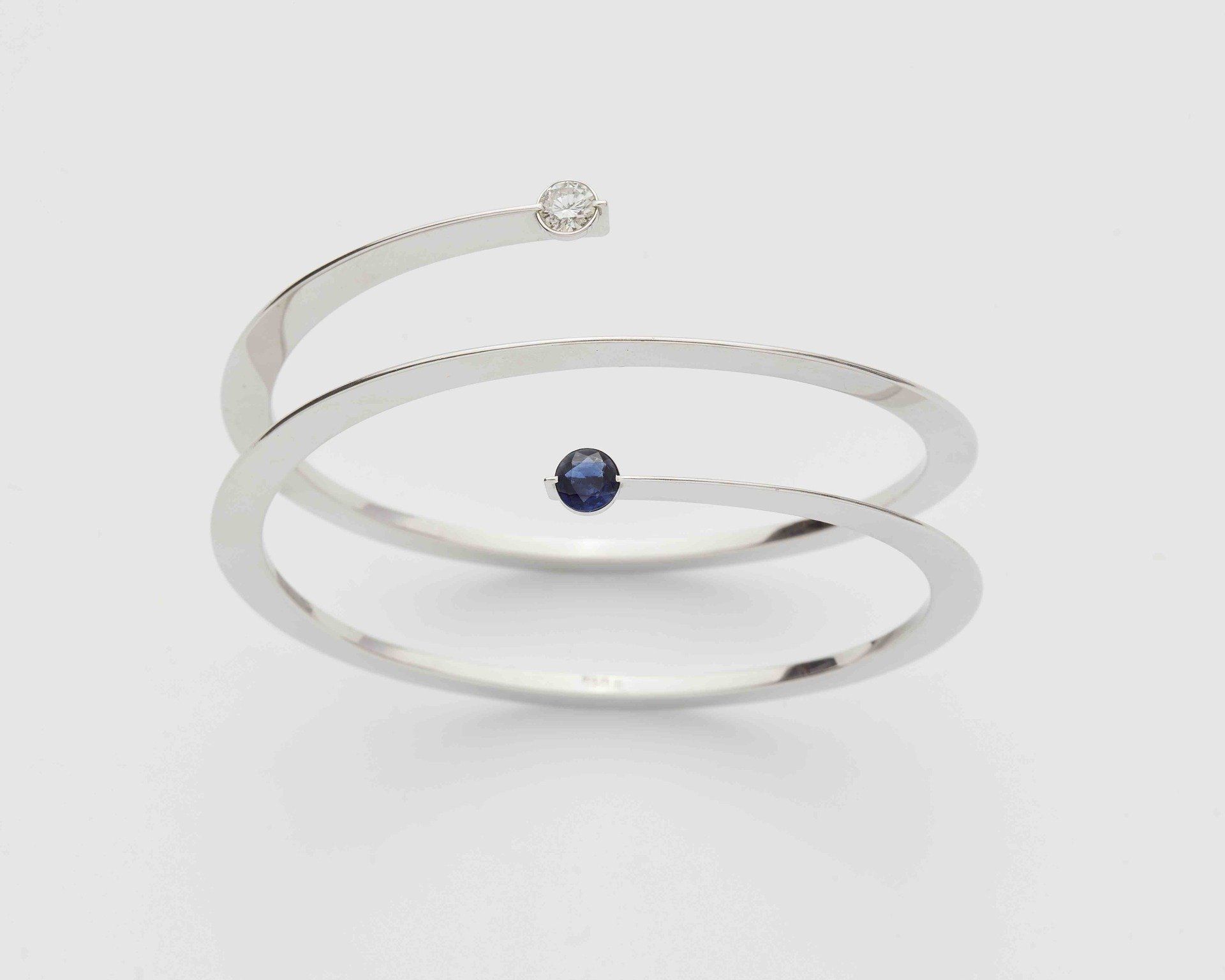 Spiral bangle, white gold, 750, diamonds, sapphires