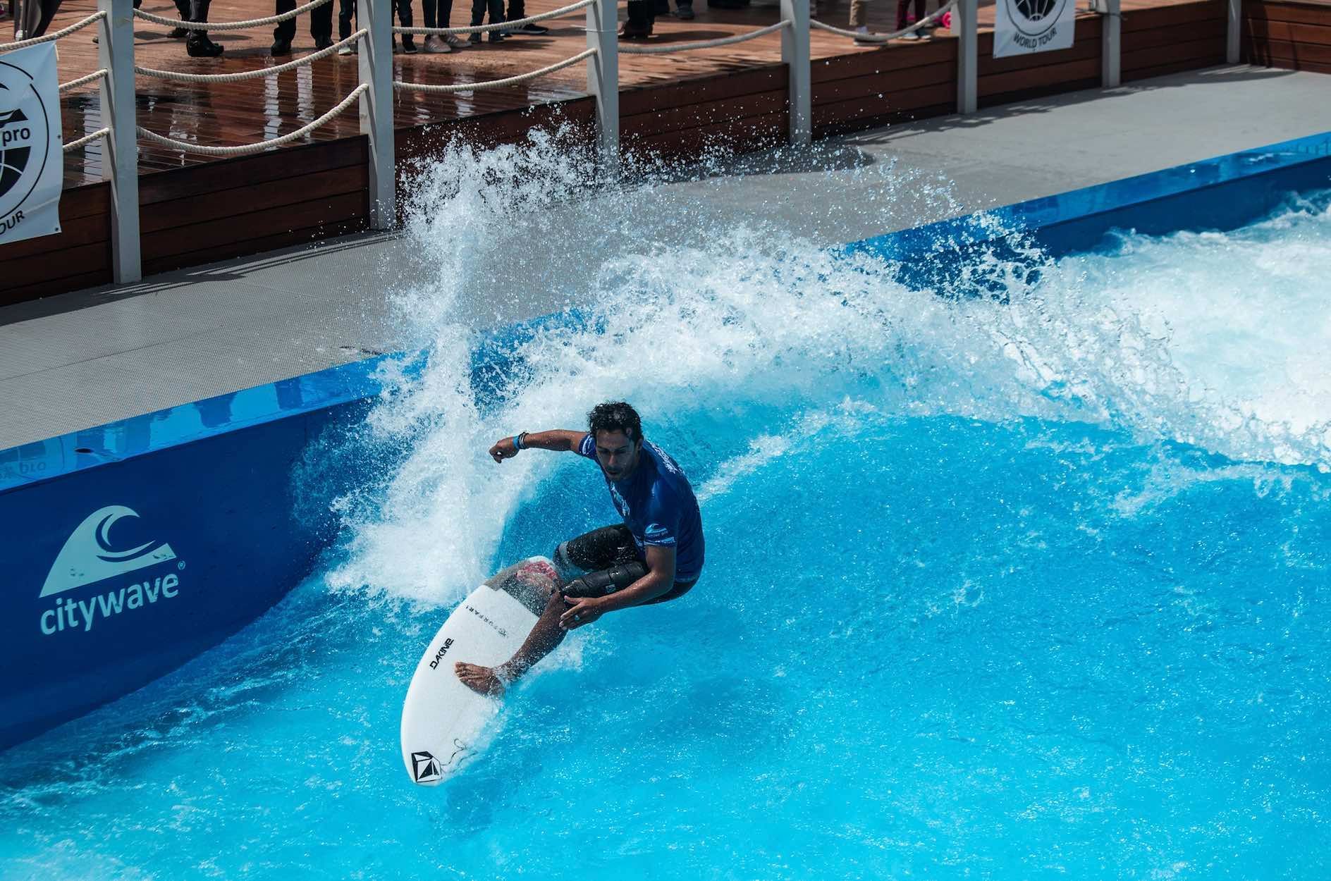 H.B.: Im Meer ist es ein langwieriger Prozess und den Takeoff muss man lange üben. Bei uns gibt es eine Haltestange quer über das Becken, an der die Anfänger ein Gleichgewichtsgefühl für die Welle bekommen. Ab der Hälfte der Stunde kann man die Stange wegnehmen und die Leute können zumindest für ein paar Sekunden stehen und wenn es gut läuft von links nach rechts fahren.