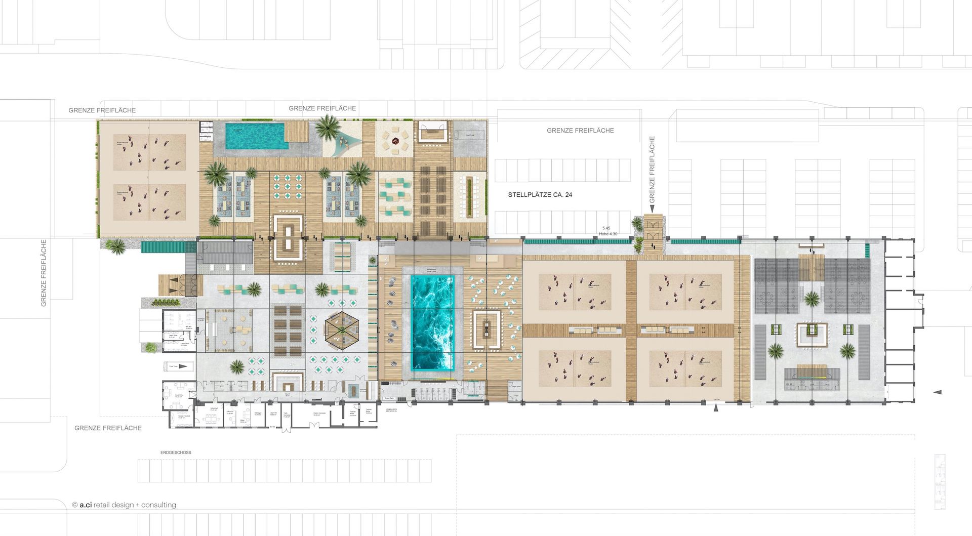 We have already received annual bookings from spontaneous athletes who have formed groups to clubs. Between the beach volleyball fields and the surf pool is the sports bar, this is where the community is to be created and where the sand sportsmen are to meet the water sportsmen. But also when the people from the business center meet at the sports bar.