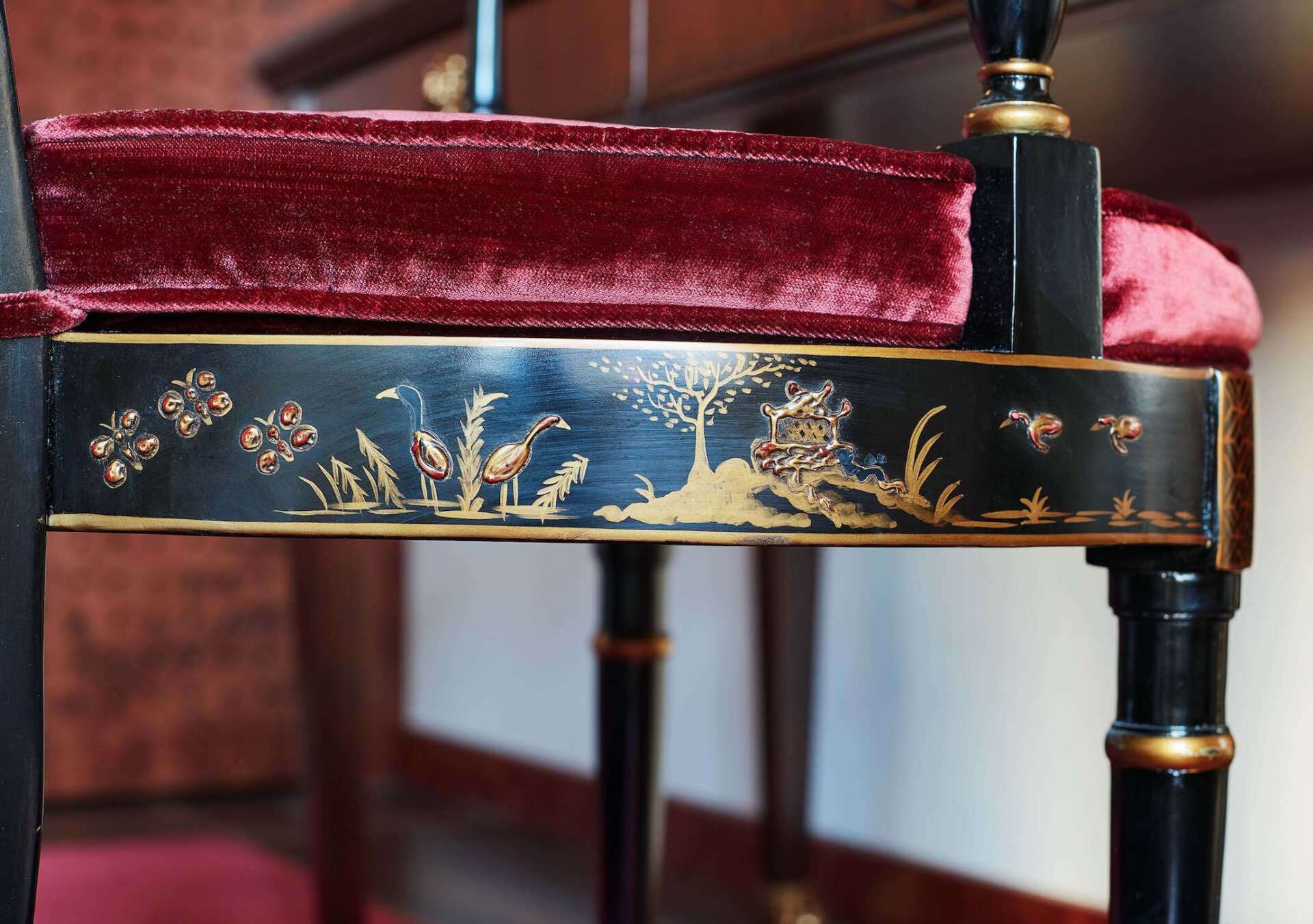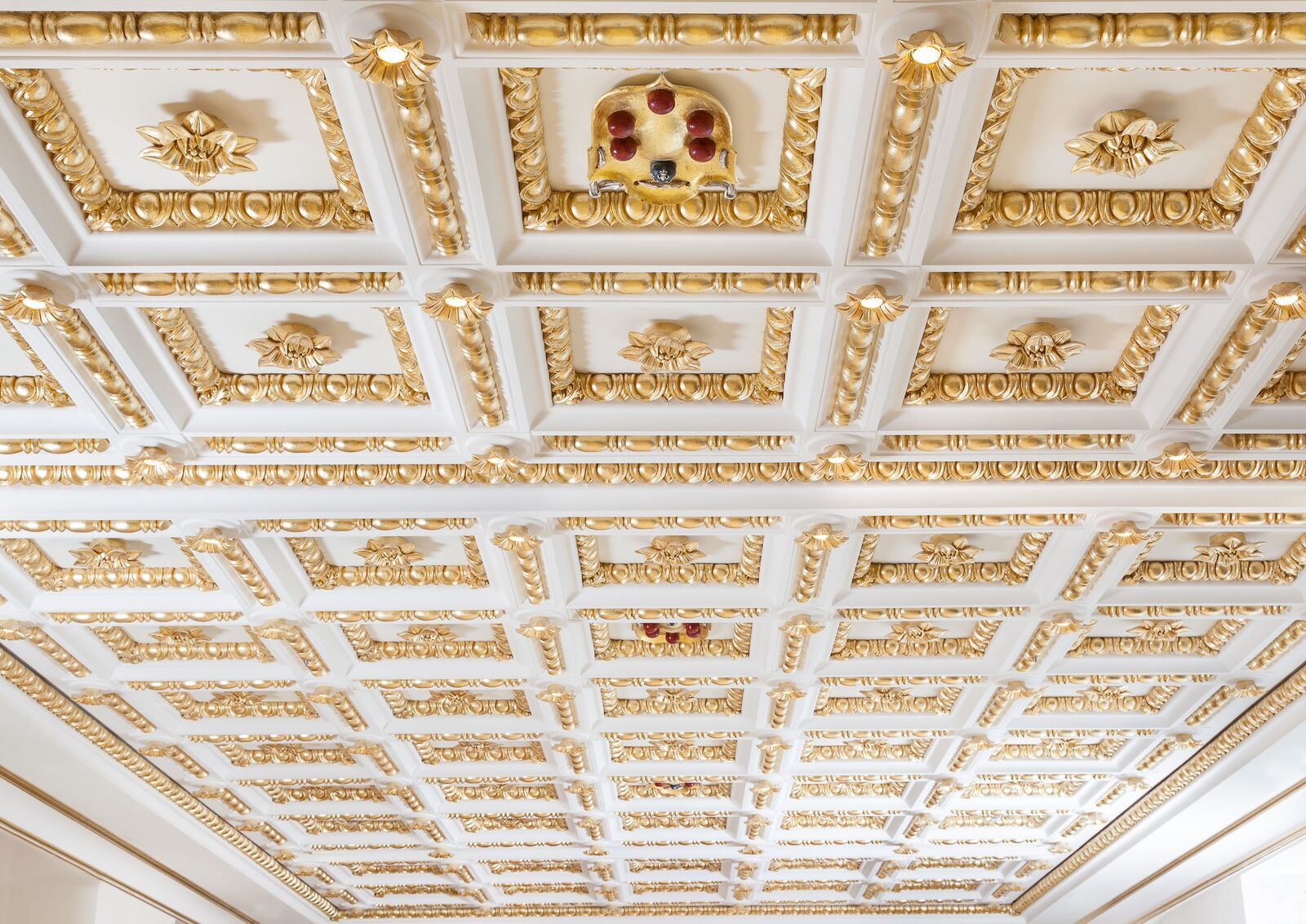 The luminous shimmer of gold leaf is immediately noticeable upon entering the foyer. The famous Medici Renaissance ceiling is painted with antique quotes. The special feature of the coffered ceiling is formed by four coats of arms embedded on the central axis of the ceiling. Of these, one bead in dark blue bears the Medici coat of arms. The ceiling is a faithful replica of the famous coffered ceiling of San Lorenzo, the Medici family church in Florence, one of the first sacred Renaissance buildings.