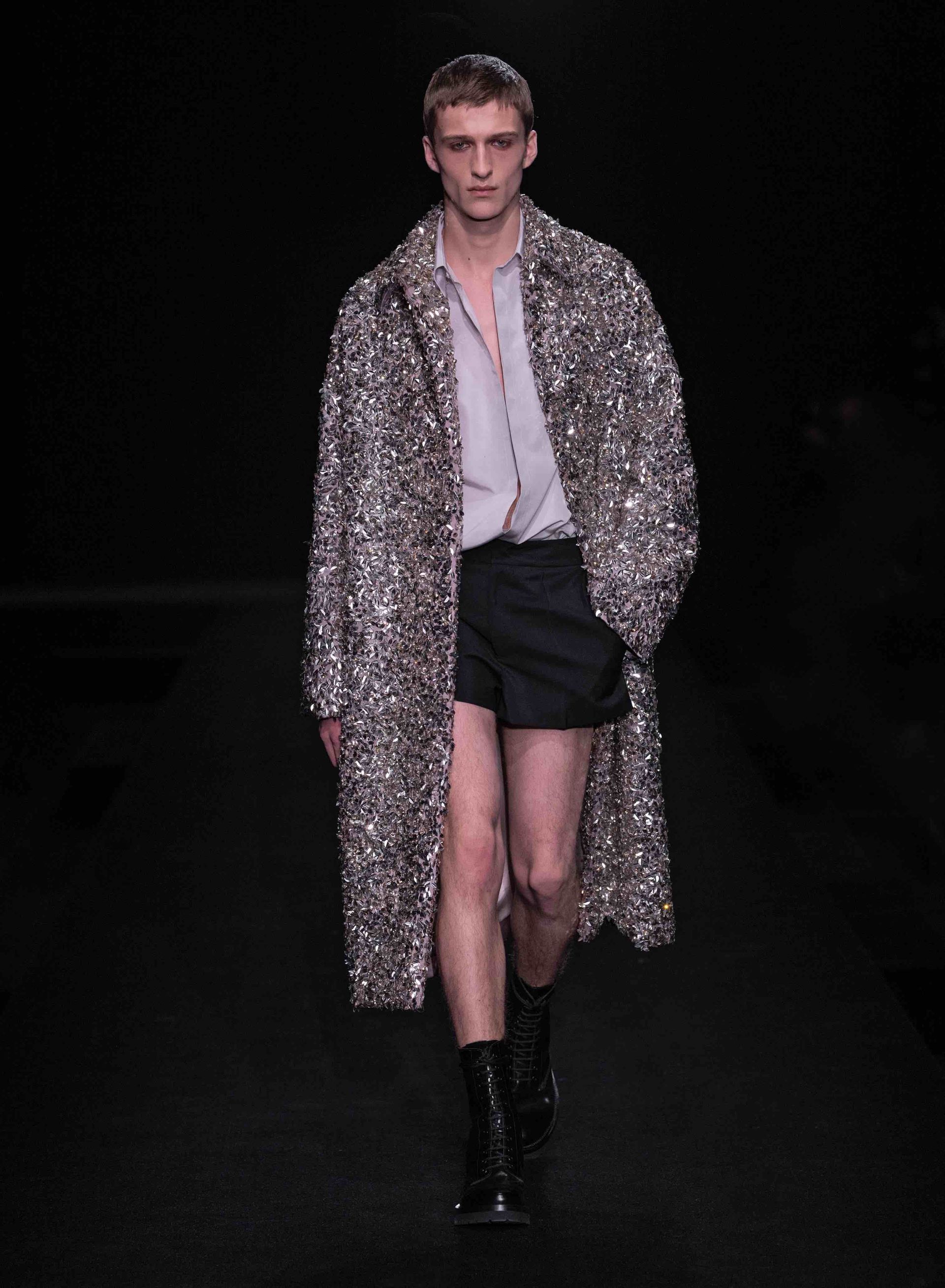 Oversized jackets and trench coats in bright colours like emerald green, blue with oversized sequins or soft in even poudre. Bordeaux-coloured sequin suit blazers, black men's coats with feathers, or plain men's organza blouses. The cuts were reminiscent of the 90s, but seemed contemporary and cool. The absolute highlight was a black men's tulle coat with embroidery.