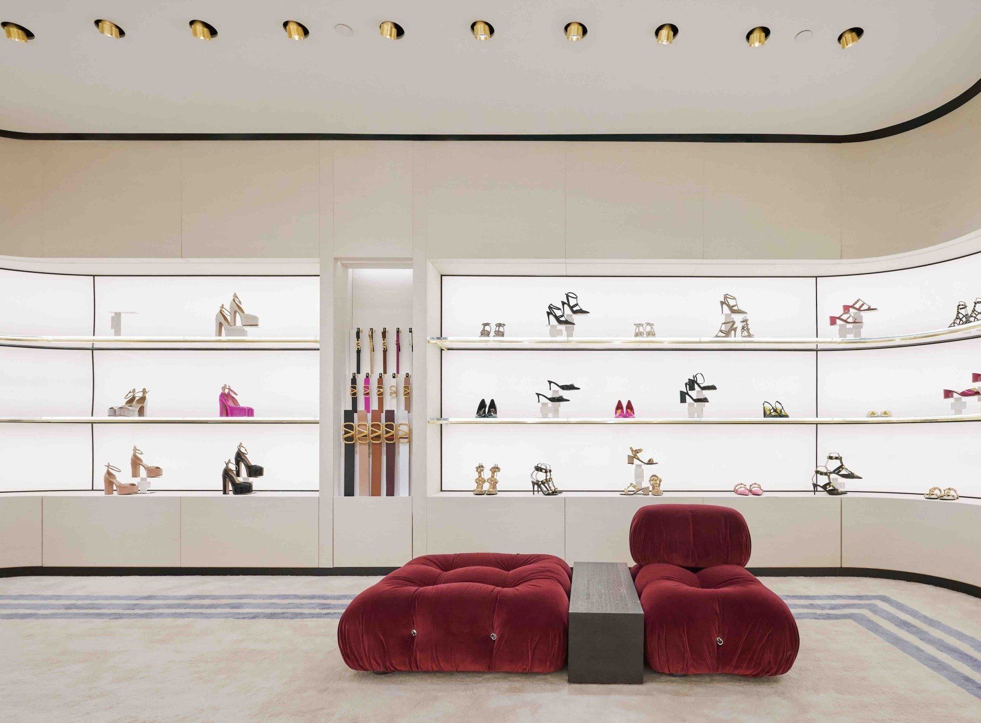 Italian and French artisans were also commissioned in this regard. Massimiliano Pipolo, Valentino's Visual Merchandising Director, created the handmade ceramic door handles and Fabio Cinti the decorative brass objects. Alexandre Logé designed the plaster chandeliers and the white objects with branches. As the boutiques are designed like a home, there is also plenty of seating, such as green, red and white Camaleonda velvet sofas, famously by Mario Bellini for B&B Italia, and graphic rugs by Golran.