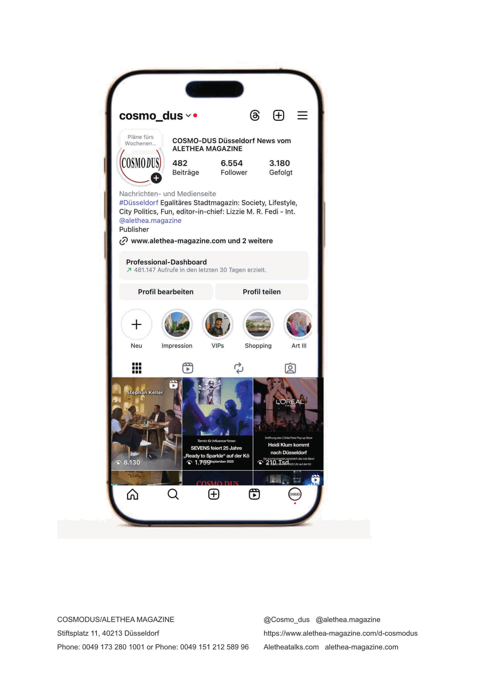 CosmoDus wurde vor zwei Jahren als Düsseldorfer Only-Stadtmagazin gegründet und etabliert sich als egalitäres Stadtmagazin, das die Metropolregion Düsseldorf mit Leidenschaft und Vielfalt repräsentiert. Mit Schwerpunkten auf Lifestyle, Fashion, Kultur, Kunst, Gemeinschaft und Stadtpolitik bleibt CosmoDus stets politisch neutral und verbindet Düsseldorfs einzigartigen Charme mit zeitgenössischen Themen. Das Team kuratiert Inhalte, die nicht nur etablierte Highlights der Stadt beleuchten, sondern auch Newcomern aus Kunst und Kreativität eine Stimme geben. Unsere Partner finden ihren Inhalt auf einer Plattform wieder, die sich von anderen Influencer-Accounts abhebt durch einen egalitären Ansatz und die Fokussierung auf historisch bedeutende Themen der Stadtpolitik und Kultur.