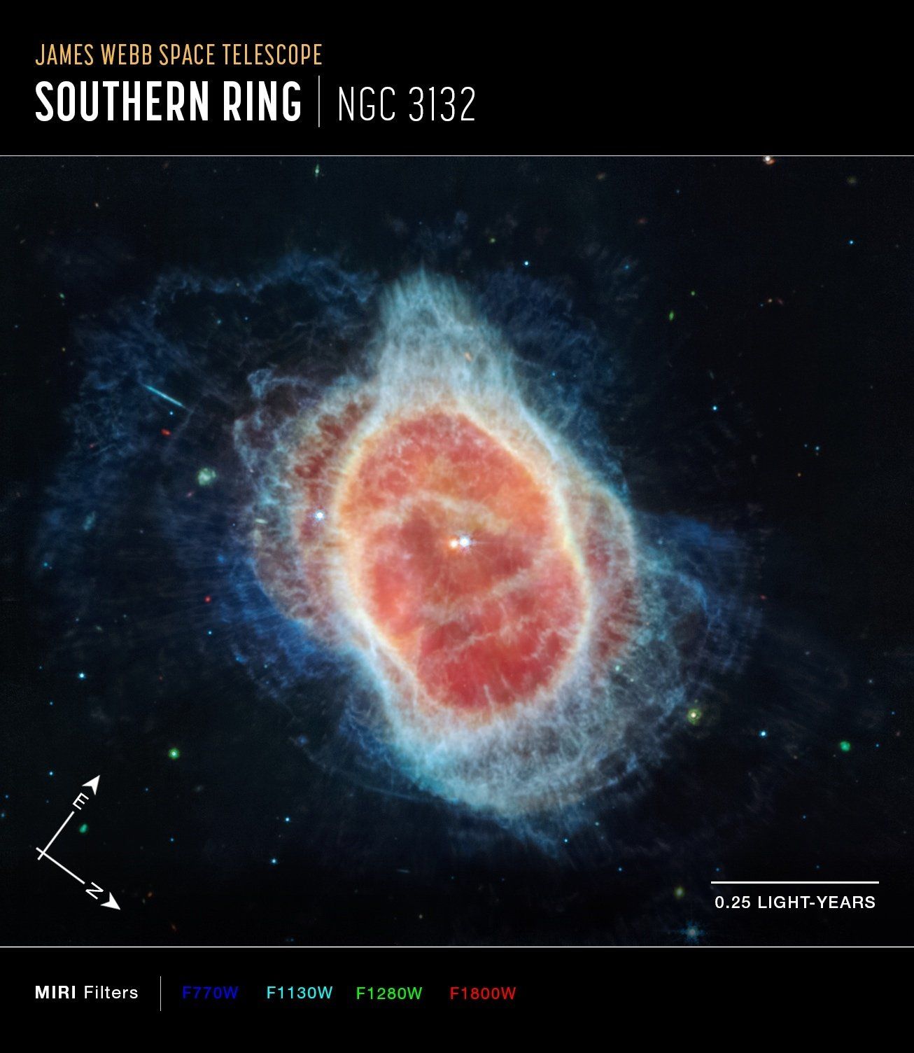 Webb captured an image of this pair of older stars orbiting each other about 2 500 light years from Earth. At the end of their lives, the stars eject gas and dust that form the nebulae or clouds that surround them.... The brighter of the two stars is younger than the other and has not yet ejected as much material. As the stars orbit each other, they set the gas nebula in motion and give it its characteristic shape.