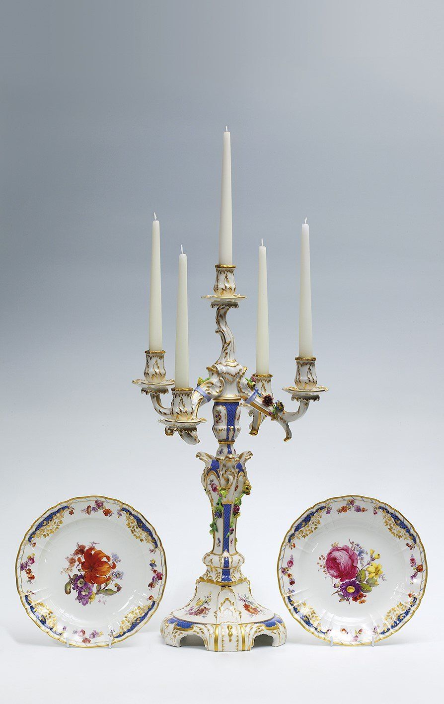 Frederick the Great wanted to furnish his residences with appropriate porcelain services, for which Meyer ultimately supplied the designs. The king also wanted his own service for the city palace in Breslau, Silesia. For this purpose, Meyer created the Antikzierrat form in 1767, which is known today as ROCAILLE. The surface is decorated with colourful naturalistic flowers framed by a blue scale mosaic and gold painting. The service for the Wroclaw City Palace remains one of the most elegant decorations in the history of porcelain.